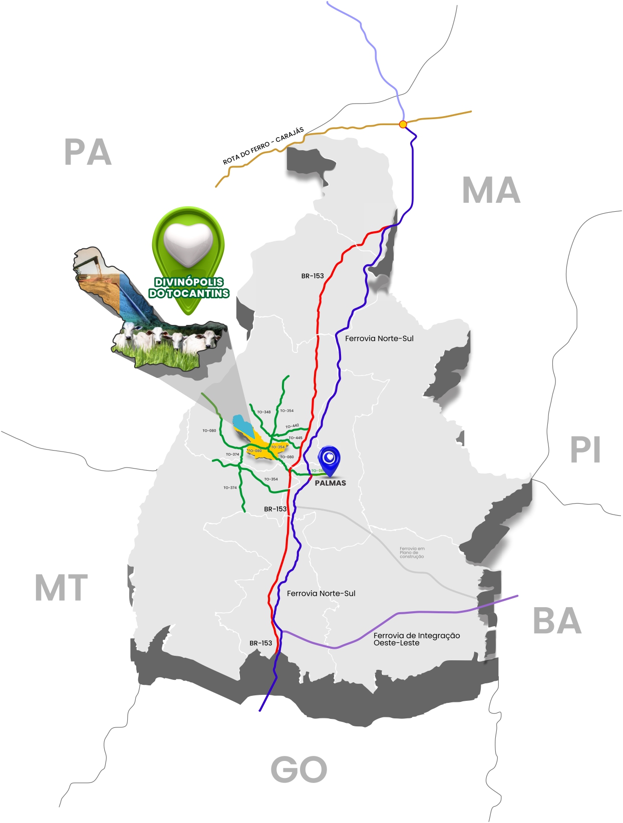 Divinópolis do Tocantins é o Portal do Vale do Araguaia APA/Cantão e está no coração da TO-080, que conecta o Tocantins ao estado do Pará. A cidade é rota de do agronegócio das rodovias